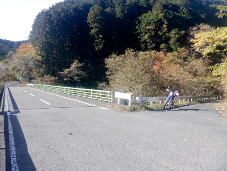 県道との並走区間を過ぎて大きく逆S字を描いて登坂していく生産の森林道。秋晴れの明るい陽射しに照らされた林道は明るさに満ち溢れ、陽当たり良好な路肩では鮮やかに染まった紅葉が目を楽しませてくれました。
