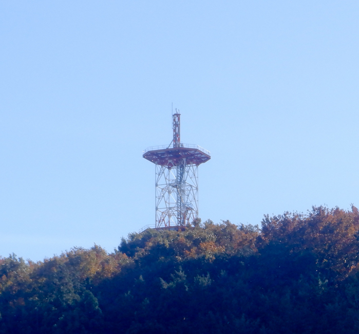 林道から南の方角、渋く褐葉した木々に覆われた山の頂きにポツンと鉄塔が立っているのを発見しましたが、あれって地デジ用の「矢板中継局」?