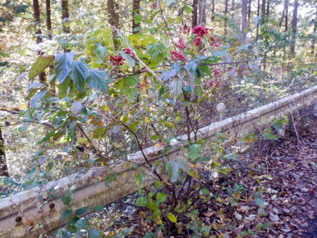 遠方に地デジ中継局の電波塔が見えていたその一方、足元の路肩のガードレールを眺めると、ガードレールを包み込むように成長した「ガマズミ」を見かけました。ガマズミは真っ赤に熟した果実をたわわに実らせていましたが、伸び放題のこの状況から察するに、生産の森林道では「放置」が久しく続いているみたいだな。
