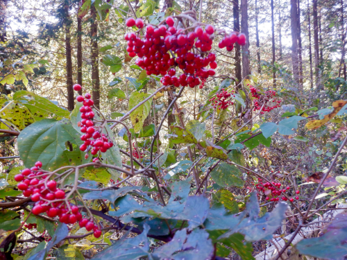 これでもかと溢れんばかりに真っ赤に熟した宝石のような果実を鈴なりに実らせたガマズミ。赤く熟した果実は生食のほか、果実酒や漬物の染色などに利用され、その昔、マタギが山で食べ物がなくなるとガマズミの実を食べてしのいだそうです。 赤ワインと同等のポリフェノールを含み、ビタミンC含有量がレモンの2倍もあって滋養が豊富なガマズミの果実ですが、鳥や猿も大好物らしいですよ。 |