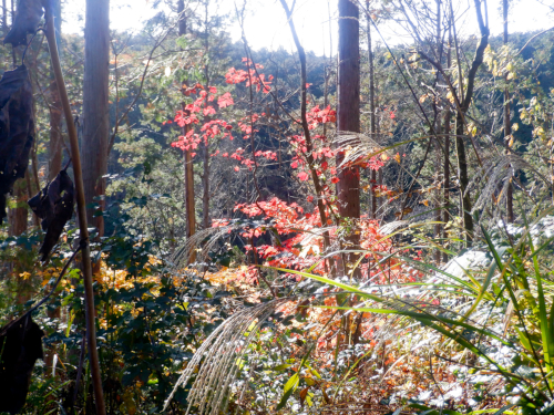 陽射しを浴びて光り輝くウリハダカエデの紅葉。生産の森林道の道すがらにあちらこちらで見かけましたが、淡く黄色味を帯びた赤色がきれい!