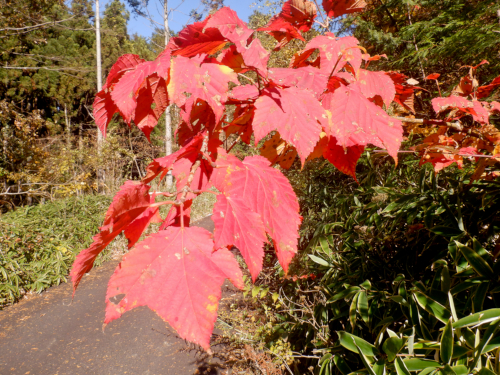 路肩の藪に混ざって一段と真紅の鮮やかさが引き立つウリハダカエデ。ムクロジ科のウリハダカエデは日光の当たり方によって黄色や赤に色づきますが、陽当たりの良い場所では鮮やかな紅色に染まって特に美しいんだよな!