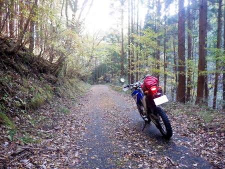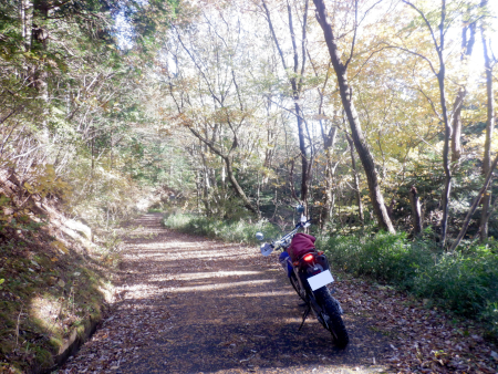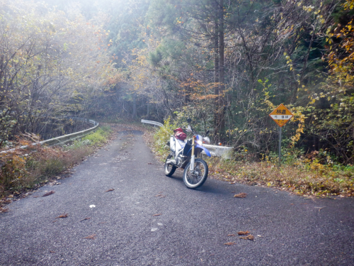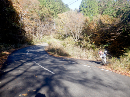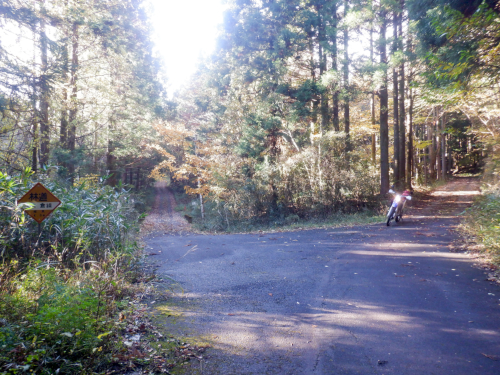 落ち葉でフロントが滑らないよう気を付けつつ、途切れることなく連続する下り坂を進んでいきますが、道すがらの紅葉は微妙。一部の広葉樹の梢は淡く黄色や褐色に色づいていたものの、全体的に緑色の葉が目立っていたんだよな〜。
