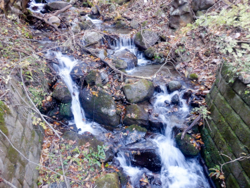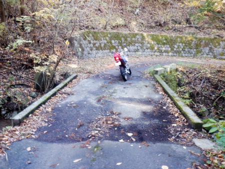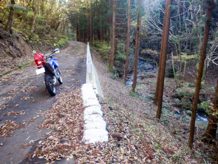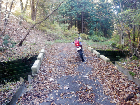 その後、やがて差しかかる逆S字のヘアピンカーブで一気に駆け下っていきますが、途中で落ち葉まみれの小さなコンクリ橋を渡ります。渡っているのは枝持沢の最上流、枝持沢源流のささやかな細い沢でした。