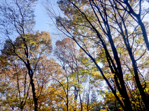 陽射しに輝く姿が美しかった淡く褐葉した木々の梢。同じ標高でも場所や地形の微妙な違いで紅葉の進行具合も変わるのでなんとも言えませんが、ミツモチ林道での紅葉度合いはやや低めだったです。