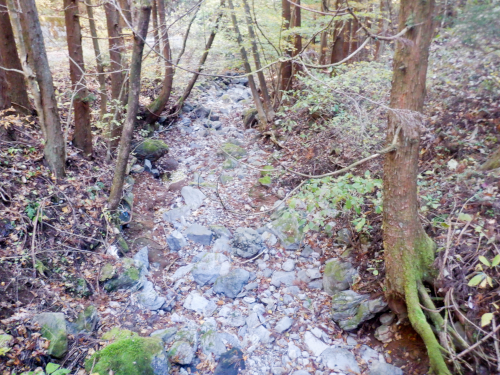 やや、水が干上がっている?! 上流のコンクリ橋から枝持沢を眺めたときには水が流れていたので不思議でしたが、手持ちの地理院地図を確認してみたところ、先ほど渡った枝持沢源流の沢とは別の沢であることが判明。