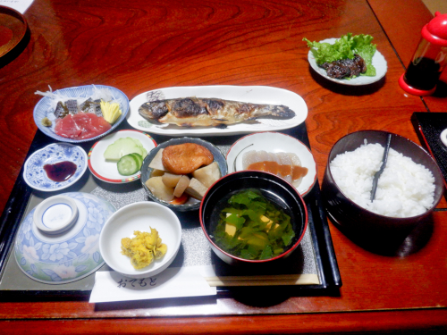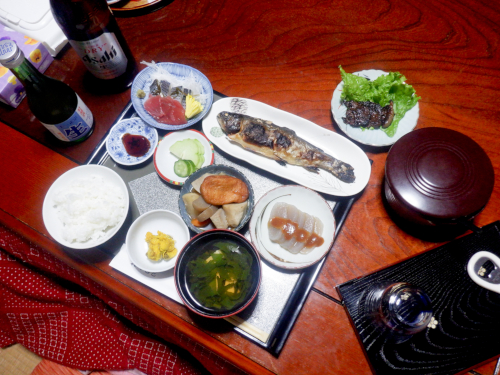 そして午後6時、お待ちかねの夕食が部屋まに運ばれてきました! ガツンとした脂っこさよりもヘルシーさがメインの素朴で家庭的な料理が所狭しと膳に並び、どちらかといえば若者よりも年配者が好みそう。でもたまに無性に食べたくなるどこか懐かしい田舎のお婆ちゃん家の夕食といった感じかな。 というわけで寺山鉱泉宿泊1日目の献立は以下の通り。 ニジマス焼き・野菜とさつま揚げの煮物・コハダとカツオの刺身・刺身こんにゃく シカ肉の味噌焼き・食用菊の酢の物 フキと豆腐のすまし汁・ウリとキュウリのお新香・白いごはん |