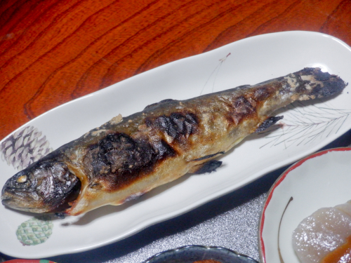 山の宿ということでメインディッシュは川魚の「ニジマス焼き」。ただし、定番の塩焼きではなくてそのままグリルで焼いた丸焼きでした。塩気が全くないのでニジマス本来の味をそのまま味わえますが、しかし、淡白すぎて味がないというか醤油が必須だったかな。個人的にはニジマスはやっぱり塩焼きの方が美味しいかと・・・。