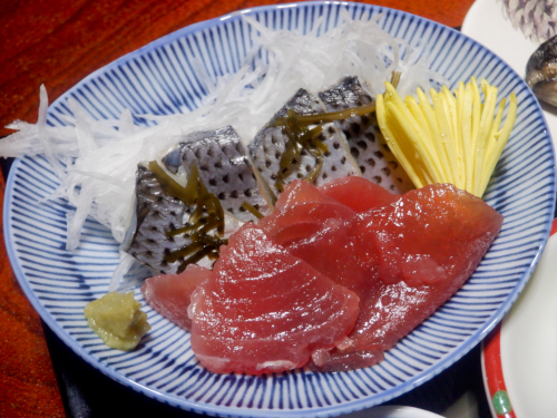 山の宿で出される刺身といえばシャリシャリな冷凍マグロの赤身が定番ですが、寺山鉱泉では「コハダとカツオの刺身」が出ました。酢で締めたコハダは地酒との相性も良くて美味! そして秋が旬の戻りカツオも美味しかったな〜。