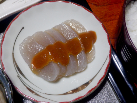 これは酢味噌で食べると美味しい「刺身こんにゃく」ですね。ヘルシーで美味しい刺身こんにゃくは山の宿では定番ですが、実は栃木県って「こんにゃく芋」の生産量全国第2位って知ってました? というわけで「こんにゃく」はカンピョウ、イチゴ、モヤシと共に栃木県を代表する特産品だったりします。