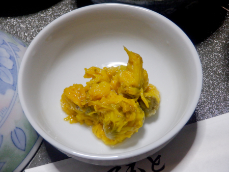 これはタンポポのお浸しではなくて「食用菊の酢の物」ですね。しゃきしゃき感とキクの花びら特有の苦味と甘酢の酸味が相まったかなり通好みな大人の味わいですが、箸休めや酒のアテとしてこれは美味しかったな。 ちなみに食用菊は鑑賞用の菊を苦味を少なく品種改良したもの。「阿房宮」や「もってのほか」などの品種が知られ、おひたしや酢の物、刺身のツマとして食べられますが、ちなみにピーマンが苦手な子供は間違いなく食用菊も苦手だと思います。 |