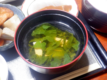 汁物は味噌汁ではなくて「フキと豆腐のすまし汁」。すまし汁はカツオや昆布でとった一番出汁を醤油や塩で味付けした透明な汁物ですが、寺山鉱泉で出されたすまし汁はフキのホロ苦さと風味が際立ってなかなか通好みな汁物だったなぁ。