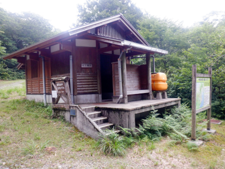 林道傍に立つ山小屋チックな登山者向けの公衆トイレ。