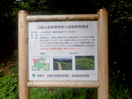 なるほどね〜。 「三国山(875.9m)」のすぐ東の山腹には 「三国山湿原植物気象個体群保護林」に指定された区域があるのですが、 これはその説明板ですね。 すぐそこの場所ならば訪れてみようという気になるかもしれませんが、 保護林までは2.1kmで徒歩65分の道のり。 さすがにメット片手にちょっと散策というわけにはいかねーな。 → 付近を散策する! |