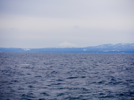 うおぉー、なんと! 青森湾の対岸、津軽山地の山々の向こうに屹立しているのは青森県の最高峰「岩木山(1624m)」じゃないですか! 山という字をそのまま描いたような三角形をした姿は富士山であり、別名「津軽富士」と称されるのも納得! 岩木山はイボ崎からは陸奥湾(青森湾)および津軽平野を挟んで直線距離にして66kmも離れているのですが、まるですぐそこにあるかのように錯覚してしまうほどの大きさですね。まさか下北半島から岩木山をも眺められるとは思っていませんでしたが、冠雪した姿が神々しいまでに美しかったぜぇ! |