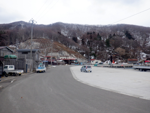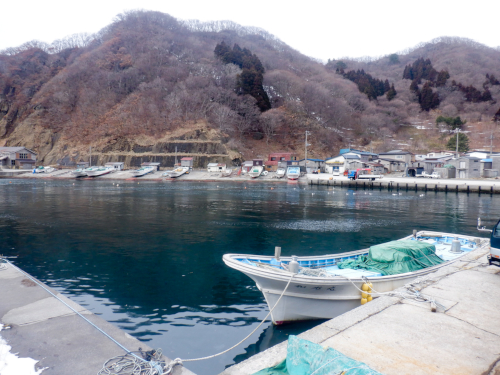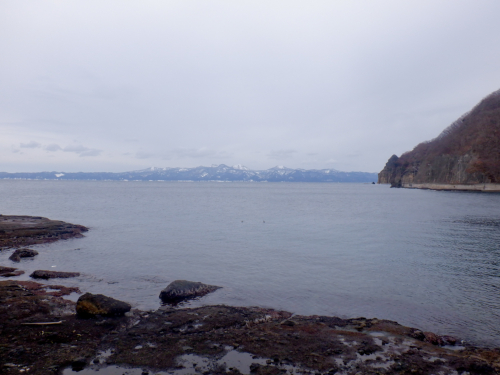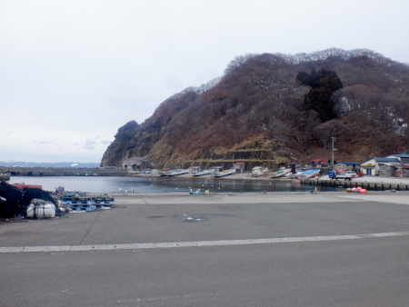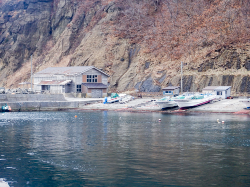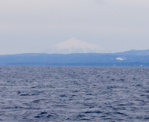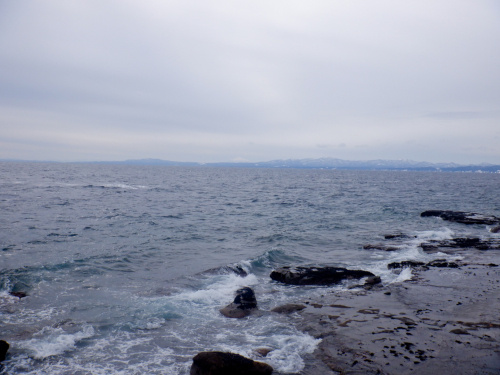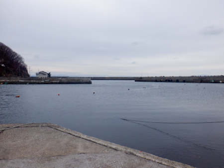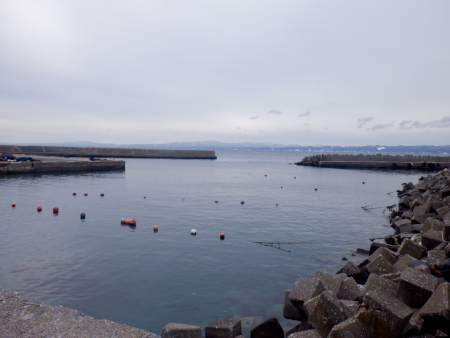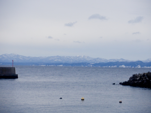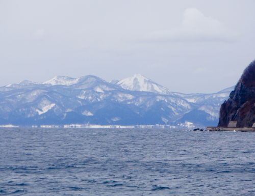 うう、寒ぶっ! 九艘泊では雪は全く積もっておらず、真冬の季節感があまり感じられなかったものの、風は速攻で鼻水ズルズルになってしまうほどの冷たさだったです。九艘泊漁港からは平舘海峡を挟んで津軽半島がすぐそこに見えていましたが、津軽山地のう山々は白く雪がつもり、やはり今は真冬であることを実感します。