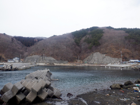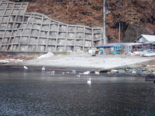 スワン? 小さな漁港の奥に設けられた芋田のささやかな船揚場。波が静かな漁港内には海鳥がプカプカと浮かんで羽を休めていましたが、カモメに混ざってたくさんのハクチョウが漂っているじゃないですか! 正確には「オオハクチョウ」ですが、ハクチョウといえば湖などに飛来するイメージが強いですが、こんな感じで海にも飛来してきます。陸奥湾に飛来するオオハクチョウは元々大湊湾に集中していましたが、餌付けなどによって近隣地区に分散し、ここ脇野沢周辺でも近年飛来数が増えているそうですよ。 |