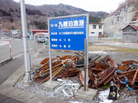 真冬に訪れる観光客はもちろん、人っ子一人誰もおらず寒々しくシ〜ンと静まり返った九艘泊漁港。今でこそ立派な道が通じていますが、江戸時代は当時の書物に「ここから脇野沢までは1里半の海上なり」と記述されるほどの僻遠地だったそうで、藩政時代の九艘泊は藩の遠追放地にされていたらしいです。 しかし、隣接する津軽藩領および陸奥湾水域の見通しに便利であったため、交通の不便な地であるにもかかわらず、陸奥湾の出入口に位置する九艘泊には古くから船の出入りが多かったらしいです。 |
