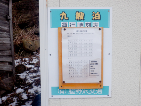 九艘泊で見かけたバス停。昭和の頃は田名部から国鉄バスが通っていましたが、現在は脇野沢交通さんが脇野沢〜九艘泊間に1日上り4便、下り3便を運行するだけ。 したがって公共交通機関で訪れる場合は、JR大湊線「大湊駅」からJRバスで脇野沢まで移動、脇野沢で脇野沢交通の「九艘泊線」に乗り換える必要がありますが、なにせ平日運行だけの過疎ダイヤなのでその場合は丸1日がかりになりますなぁ。参考までに九艘泊線のダイヤは以下の通り。 九艘泊 8:41 → 脇野沢 8:56 脇野沢 10:45 → 九艘泊 10:55 九艘泊 10:55 → 脇野沢 11:10 脇野沢 14:42 → 九艘泊 14:56 九艘泊 14:56 → 脇野沢 15:10 脇野沢 15:30 → 九艘泊 15:44 九艘泊 15:44 → 脇野沢 15:58 ※土曜、日曜、祝日、祭日、年末年始(12 / 31〜1 / 1)は運休 ※運賃は九艘泊〜脇野沢片道450円 |