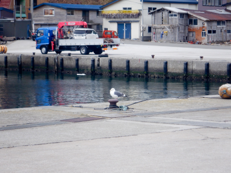岸壁の黒茶に錆びたボラード上でぽつねんと羽を休めるカモメ。漁港にたむろする海鳥の定位置ですが、やっぱり漁港にカモメは似合うぜぇ。