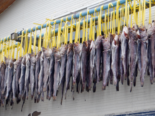 というわけで九艘泊で見かけた寒干し中の「棒タラ」です。舟小屋の壁にこれでもかと大量のタラがぶら下げられているのを見かけましたが、棒タラはおせち料理にも欠かせないし、金槌でガシガシ叩いて軽くあぶってマヨネーズをつけて食べるなど、酒のつまみや珍味としても最高! う〜ん、1本欲しいな〜。