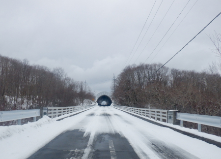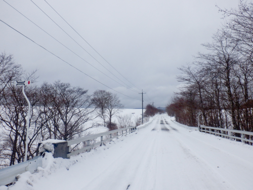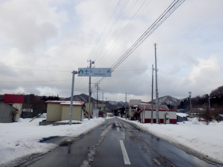 海岸部の九艘海岸部では雪は全く積もっていなかったのに、内陸部に入ると途端に雪が積り始めて県道も真っ白になりました。 ちなみに数年前までは、かもしかラインの湯野川温泉〜佐井間は冬季閉鎖されていたのですが、それがいつの間にか通年通行可能になっていたので、今回、仏ヶ浦および佐井を経由して湯野川温泉に向かうことにしたというわけ。 |