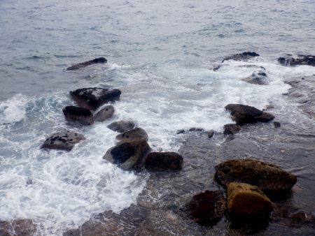 鼻につく磯の香りに誘われて路肩の堤防から下を眺めてみると、打ち寄せる波で激しく白波立っていました。ここは「海峡」ということで、潮の流れもそこそこありますが、平舘海峡での最大流速は夏の大潮の時で1ノットを少し超えるくらい。 時速に換算すると1.8kmほどで、流速が4ノットもある「黒潮」に比べれば全然遅く、また、陸奥湾全体としては全般的に潮の流れは弱いのだそうです。ちなみに平舘海峡では、陸奥湾に入る海水は津軽半島寄りを、陸奥湾から出ていく海水は下北半島寄りを流れますが、湾内の海水が入れ替わるのに要する日数は3ヶ月くらい。 |