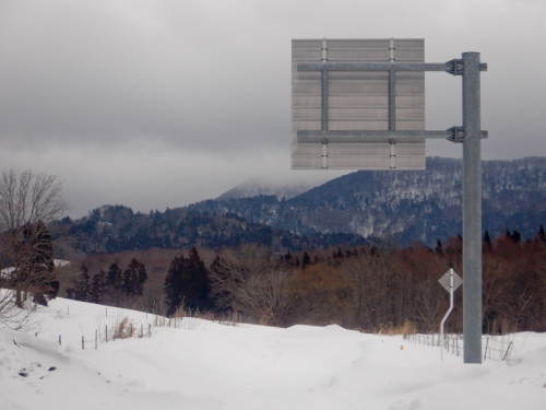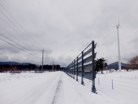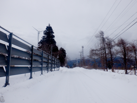 スノーシェッドを抜けた先も一面雪まみれでしたが、野平では道沿いに風力発電用の小型風車を見かけました。でも野平に風力発電所はないはず。