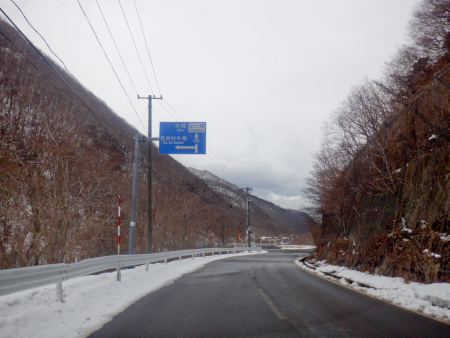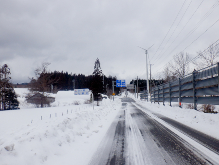 そんな感じでガチガチに凍結した県道を進んで行くと、やがて行き先表示板の掲げられた十字となった交差点が見えてきます。