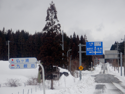 交差点の左折側は海峡ラインの脇野沢方向ですが、こちらは冬季閉鎖中。除雪されていないので道路は深い雪に埋もれていますなぁ。ちなみにこの交差点から脇野沢までは海峡ライン経由でおよそ25km。それが川内町経由だと45kmくらい。