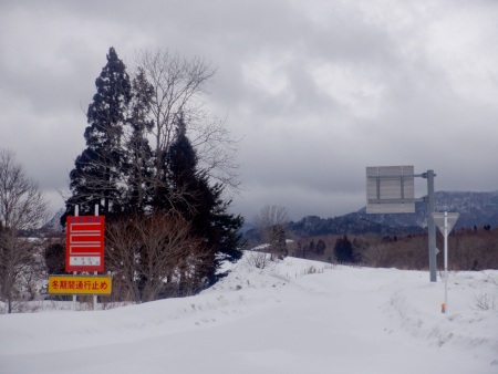 深い雪で閉ざされた海峡ラインの脇野沢方向。脇野沢から「人切山(458.8m)」や「湯ノ沢岳(557.5m)」、「アンド山(6458.6m)」の山間を縫って野平へと至る海峡ライン(R338)は、かつて「牛滝越」と呼ばれ、江戸時代の書物で「深山幽谷九曲折坂」と表現されるほどの難所だったそうです。