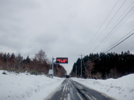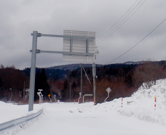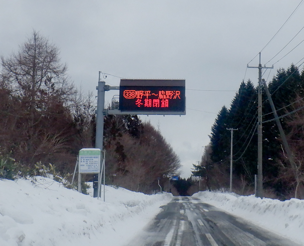 うむ。R338(海峡ライン)の野平〜脇野沢間が冬季閉鎖中であることを示す電光掲示板ですが、観光客のいない真冬の季節に脇野沢から海峡ライン経由で野平や佐井方面に向かう地元車なんてまずいねーし、当然かな。