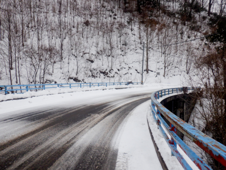 野平から佐井村に入って真冬の海峡ラインを進んでいきますが、やがて「牛滝川」伝いに緩く下っていきます。しかし、仏ヶ浦まではひたすら山深い山中を巡るコースが続いて海は全く見えていなかったです。