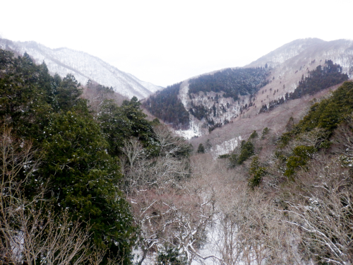 いつの間にか雪がちらつき始めてしまった牛滝川の谷間。この谷間伝いに1kmほど下った牛滝川の河口に牛滝集落があるはず。海上、陸上ともに公共交通機関はなにも通じておらず、九艘泊よりも僻地度は高くて下北半島の中でも訪れにくい場所ですが、それをさらに訪れにくい真冬の季節に訪れちゃおうというわけ!