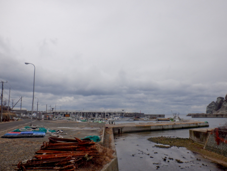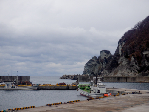 牛滝川沿いの僅かな平地に民家が連なる集落を進んでいくと、河口に架かる橋を渡った先に牛滝漁港がありました。漁港は小さな湾を防波堤で仕切った内側にあり、小雪混じりで吹き付ける風が猛烈に冷たかったですが、ちょっと散策してみます。