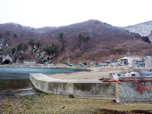 牛滝川の河口に設けられた牛滝漁港の北側、すなわち漁港がある湾の右手は砂浜っぽくなっていて、漁の小舟が雑然と並べられていました。また、浜には重機が数台留め置かれてなにかの工事が行われていたようですが、海水がとてもきれいです。