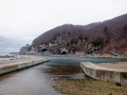 牛滝川の河口です。こんな感じで牛滝川が注ぐ河口は小さな湾になっていて、その左半分が牛滝漁港になっています。湾漁港のある湾を取り囲む断崖は北は仏ヶ浦の遥か先の佐井まで、南は九艘泊まで途切れることなく続いているため、海峡ラインが完成する以前の牛滝はまさに陸の孤島だったんだよな〜。 そのような地理的条件もあってか、150年ほど昔の藩政時代の牛滝は九艘泊と同じく、南部藩の「遠追放六ヵ所」の1つにされていたりもします。 |