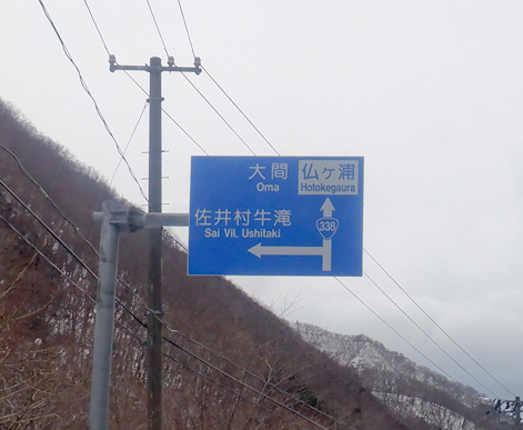 県253の終点になっていて、脇野沢から大間に向かう通称「海峡ライン」ことR338に接続する交差点です。脇野沢からR338を通ってくれば、仏ヶ浦までの距離は川内町経由よりも格段に近いのですが、しかし、生憎と脇野沢〜野平間は冬季閉鎖中。この季節は川内町経由で向かうしかありません。 なお、「福浦」と記された右折方向は野平〜福浦間を結ぶ野平林道になっていますが、野平林道のダートはとうに全滅して全線舗装済み。それでも野平から佐井に行く場合の便利な近道なのですが、生憎こちらも冬季閉鎖中。 |