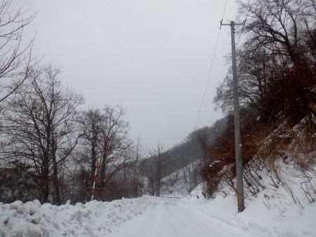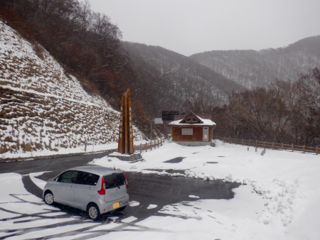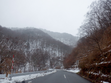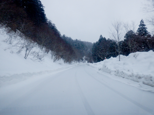 峠の急坂を下りきると、その後は湯の川伝いになだらかに下っていきますが、道すがらの景色は一面の銀世界。積雪量が減って冬季閉鎖されなくなった状態でこれなので、ここ、以前は相当な量の雪が積もっていたことが窺い知れますね。