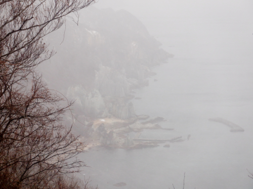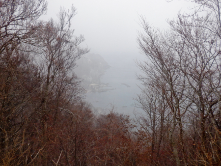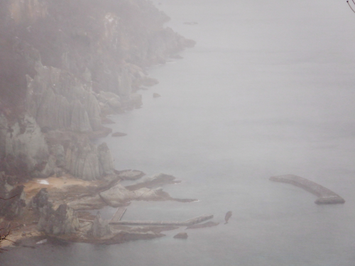 展望台も兼ねている仏ヶ浦駐車帯からだと、仏ヶ浦は南南西方向の正面に位置していて距離は950mくらい。駐車帯の端からそちら方向を眺めてみますが、生憎と雪が結構な勢いで降り始めてしまい、おかげで視界は悪かったです。