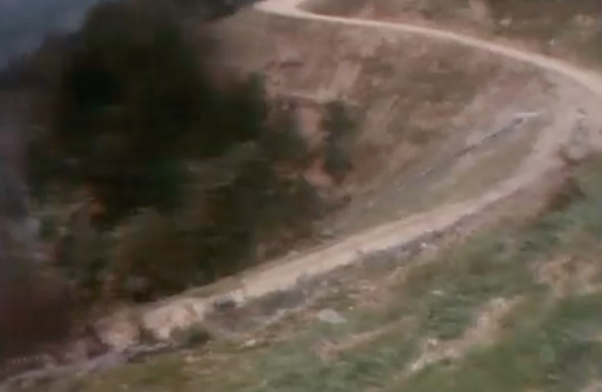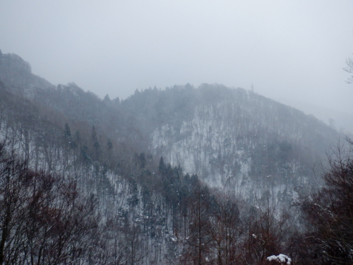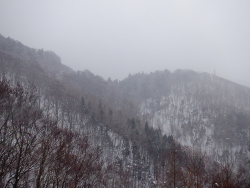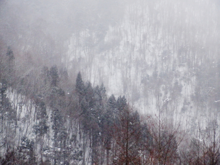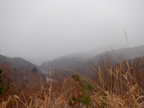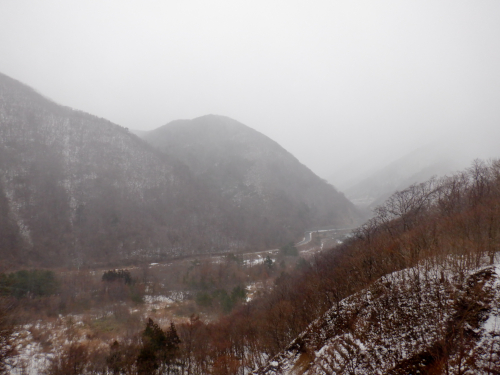 現在時刻は午後4時。峠越えの途中で再び路肩に立ち止まって景色を眺めますが、夕方になって山の気温は凍死レベルにまで急激に低下。もしもここで車がエンコして立ち往生でしたらと想像すると怖くなってきますが、寒さもさることながら、風に吹き飛ばされた小雪がバチバチと顔面に当たって痛かったぜぇ。