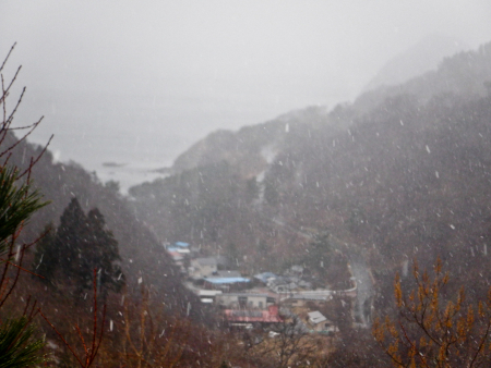 降りしきる雪の中の長後集落。ささやかな家並みとその先の海、さらには集落をかすめて通り抜けていく海峡ラインの道筋が見えていましたが、いかにも真冬の下北半島西海岸らしい寒々とした光景だな〜。気温も普通に氷点下だったし・・・。