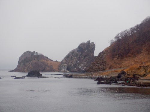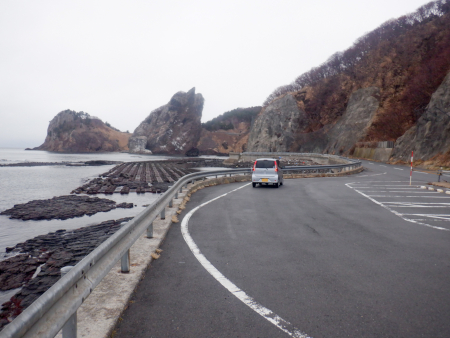 懐かしの磯谷林道入口を通過してさらに佐井方向に進んでいくと、やがて「願掛岩」が現れました。いつの間にか雪も止んでいたので立ち寄ってみます。