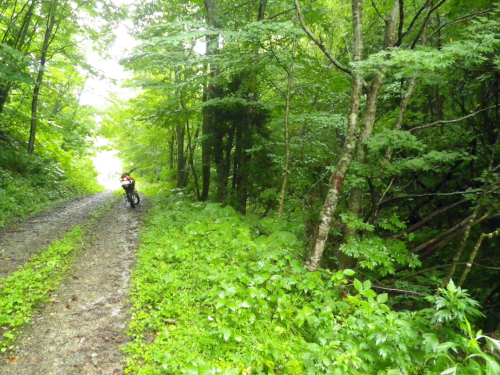 ほれ、こんな感じで鬱蒼とした森の奥へと登っていく林道入口が! ここを入っていくとすぐにダートが開始していますが、しかし、普通に海峡ラインを走っていると、磯谷林道の存在に気がつくことなく通り過ぎてしまうと思います。