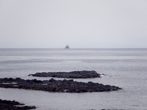 続いて願掛岩から左手、西南西の方角を眺めてみると、佐井村磯谷の沖合1.5kmに浮かぶ「大魚(おおよ)島」が小さく見えていました。ようく眺めると毛が生えているかのように灯台が立っているのが確認できましたが、あれは付近で座礁する船が多かったことから1960(昭和35)年に建設された「大魚島灯台」ですね。 島の周囲で「(オオヨ)」という魚がよく獲れたことからその名がついた大魚島。灯台が設置されているため船着場と灯台への階段があり、それ以外はなにもない小さな無人島ですが、江戸時代の旅行家である菅江真澄さんは、その著書の中で「磯谷と長後の間の沖合に大魚島がある」と書き残しています。 |