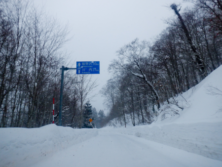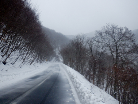 そりゃあ、同じ青森県でも八甲田とかに比べれば雪は少ないですが、それでも峠付近ではこの通り。路面はガチガチに凍結し、路肩に厚い雪の壁が連なります。