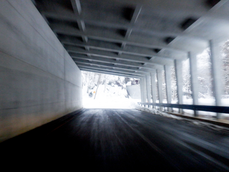 峠を越えて小刻みにカーブを繰り返しつつ坂道を下っていきますが、雪崩が発生しやすい九十九折りの下り急カーブ地点など、地形的に険しい場所にはスノーシェッドが設けられていました。積雪期の交通を確保するためのものですが、かもしかラインが冬季閉鎖されていた頃はなかったような気がします。
