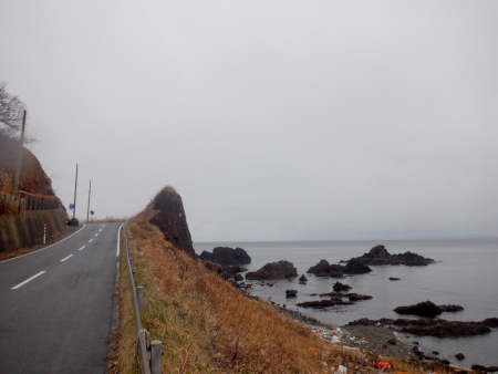 矢越岬に突き出た願掛け岩付近から眺めた津軽海峡。海岸付近には願掛岩以外にも大小無数の奇岩が点在しているのが圧巻でしたが、願掛岩から38km離れた対岸の北海道は鉛色の冬空に隠されてほとんど見えていなかったです。