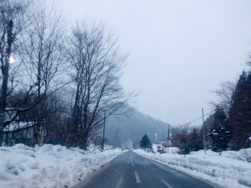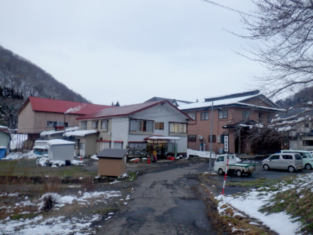 さらに下って今は無住の地となっている「湯野川開拓」部落跡を通り、かつては薬研方面への便利な山越えルートであった湯の川林道の雪に埋もれた入口も通り過ぎて、今日の目的地である湯野川に到着。やがて民家が淋しげにぽつりぽつりと現れてきますが、そのまま集落のメインストリートである県46を進んでいくと・・・。