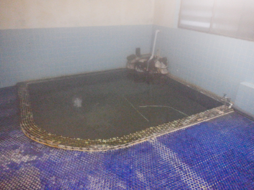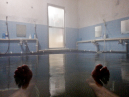というわけで昨年の冬に訪れて以来、一年ぶりとなる岡村旅館の温泉です。浴槽は5、6人が同時に入れるくらいの大きさで、かけ流し状態でなみなみと湛えられた源泉が縁からオーバーフローし続けているのがイイ感じ。日帰り入浴客で混むような温泉ではないので、静かにのんびりと24時間いつでも温泉を堪能できるのが最高!